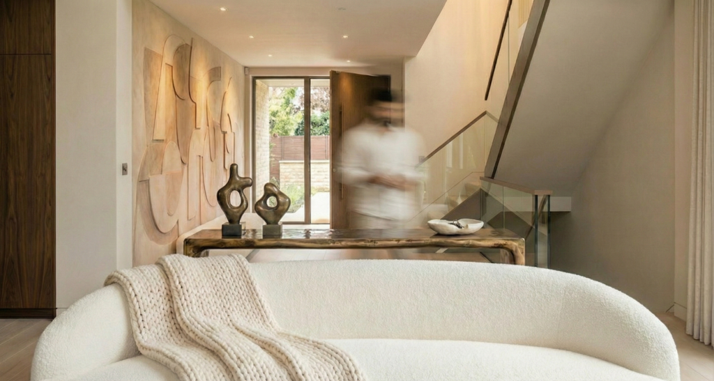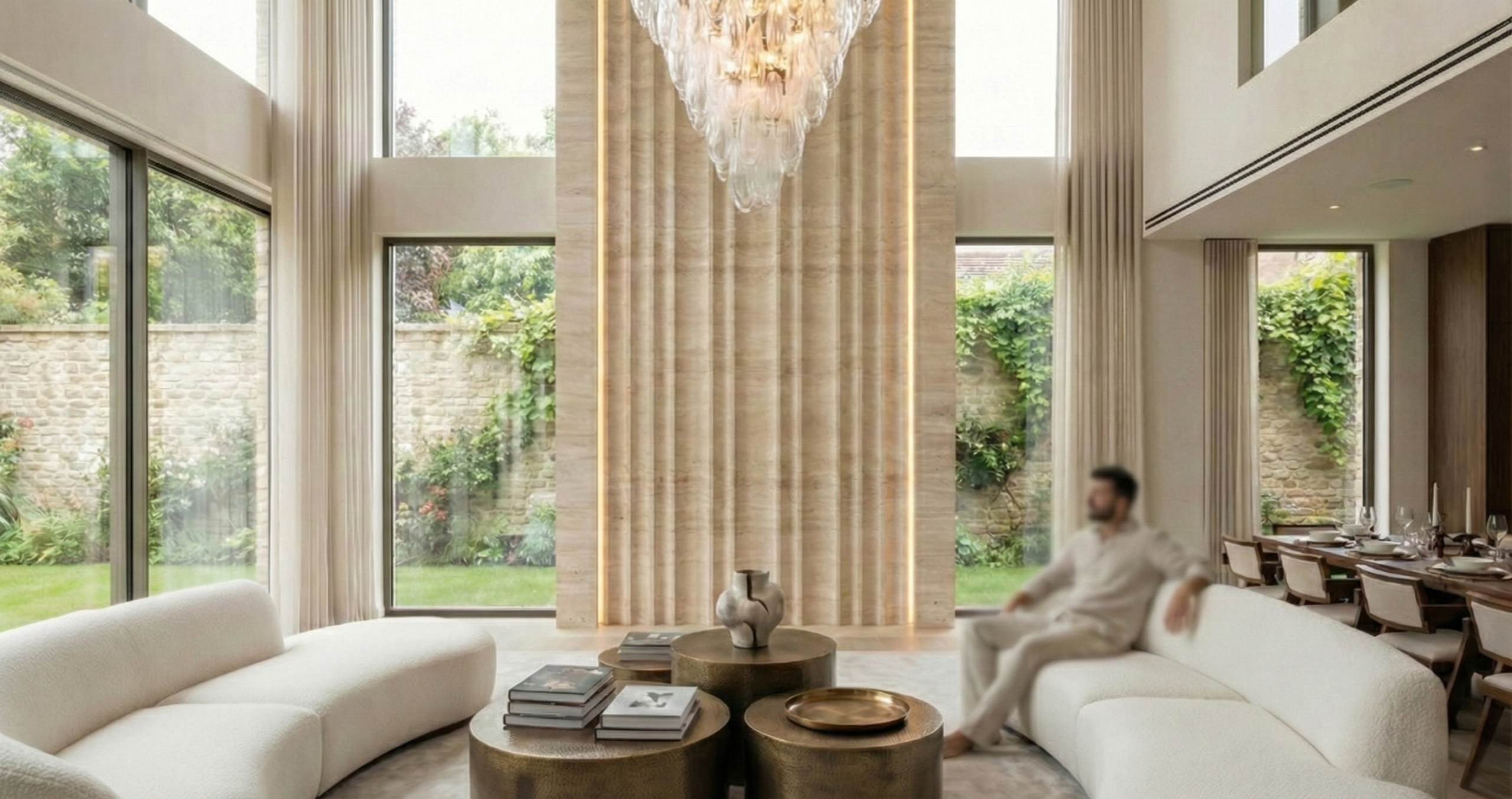 This private residence is organized around a central double-height volume that establishes vertical connectivity and maximizes daylight penetration. The core spatial intervention is a monumental fluted stone cladding that rises through the atrium, emphasized by integrated vertical linear lighting and a sculptural glass chandelier.