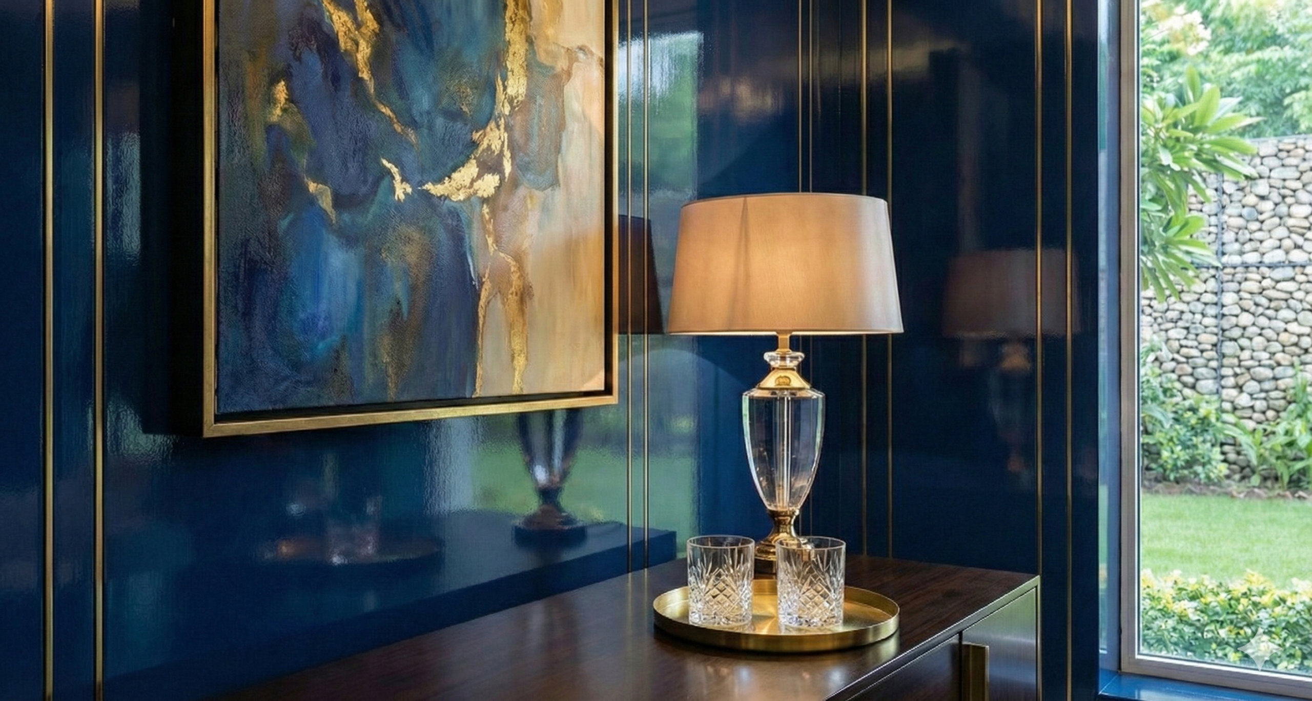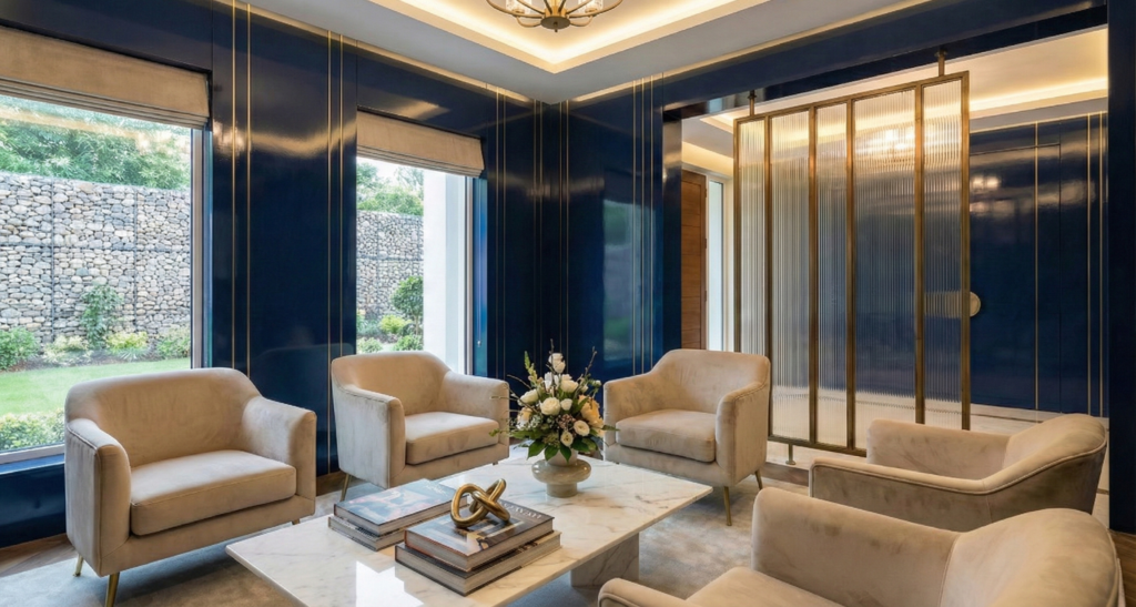- Zoned Atmospheres: Distinct separation between the serene, neutral open-plan living areas and the saturated, high-contrast formal lounge featuring blue paneling and fluted glass screens.