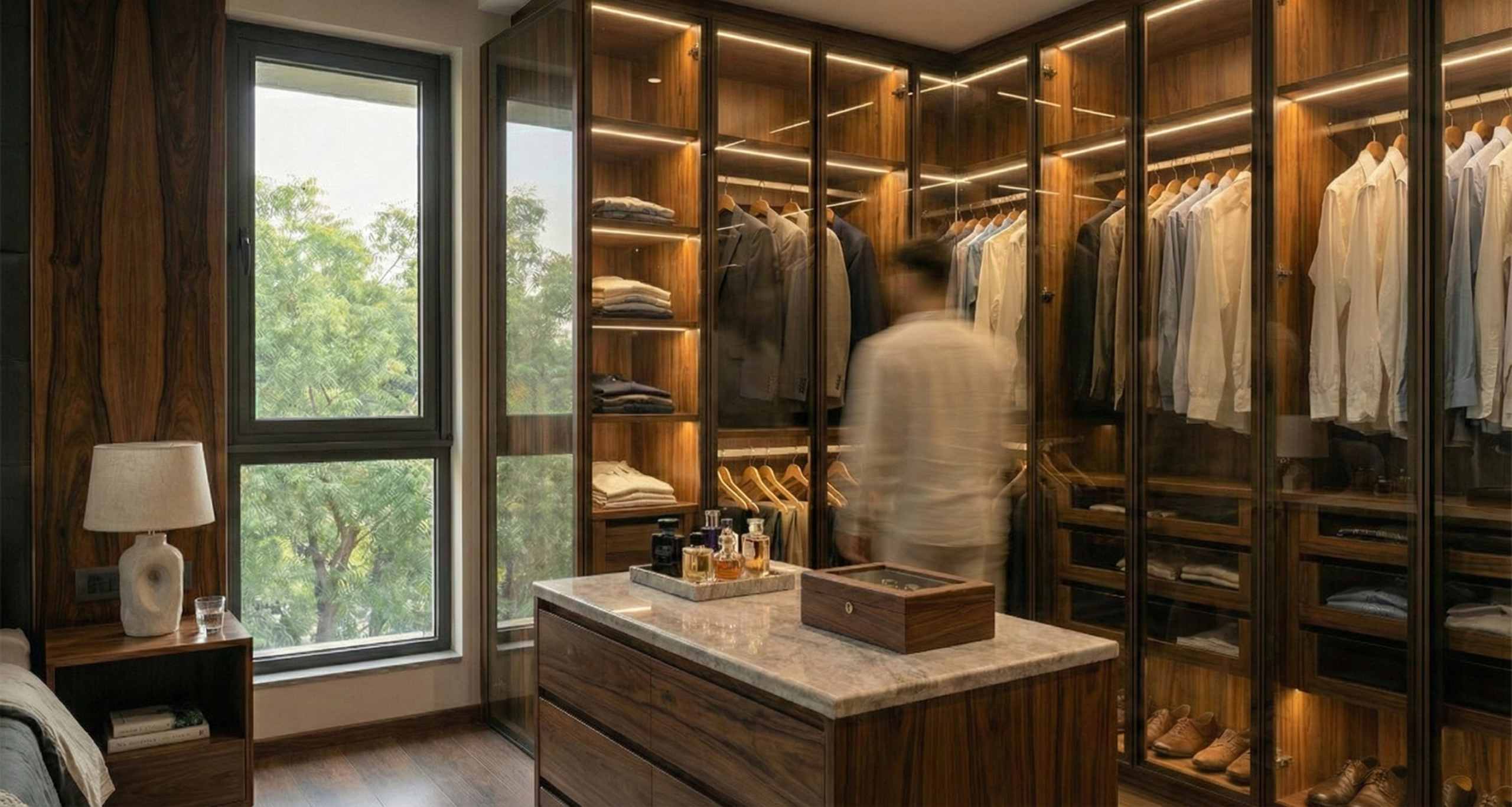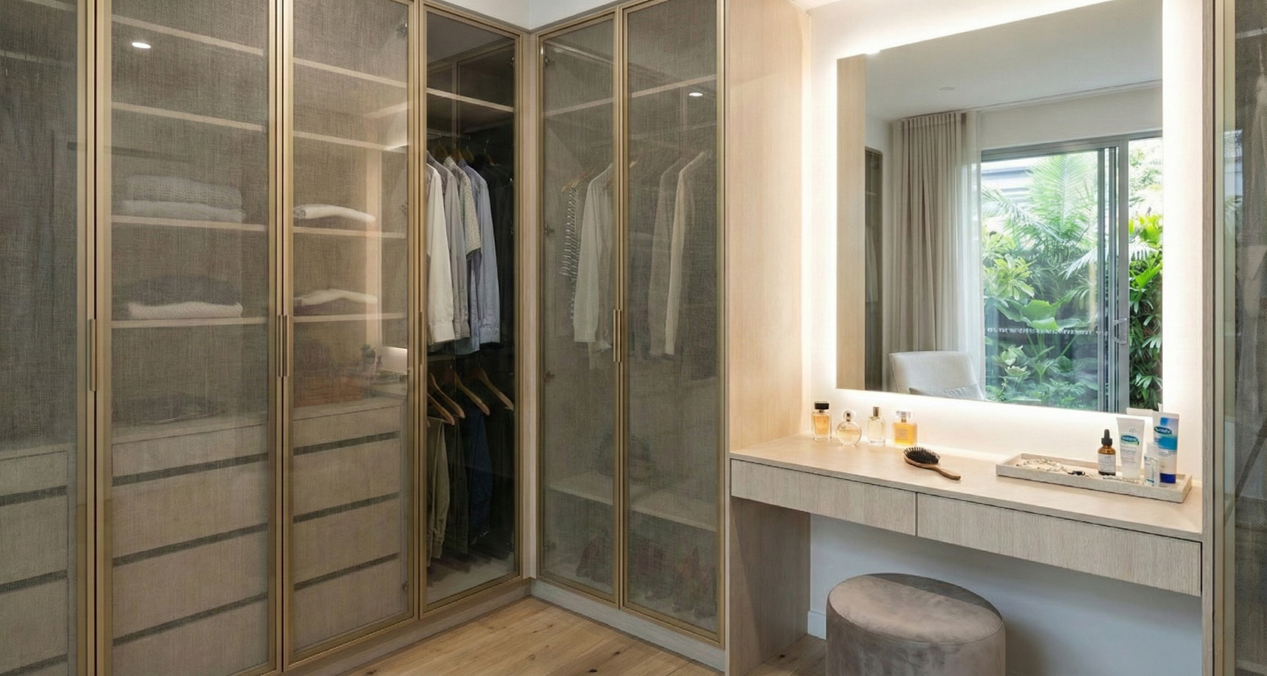 - Bespoke Joinery: Custom joinery defines the functional zones, from the grid-patterned leather headboards in the master suite to the illuminated glass-fronted walk-in closets.