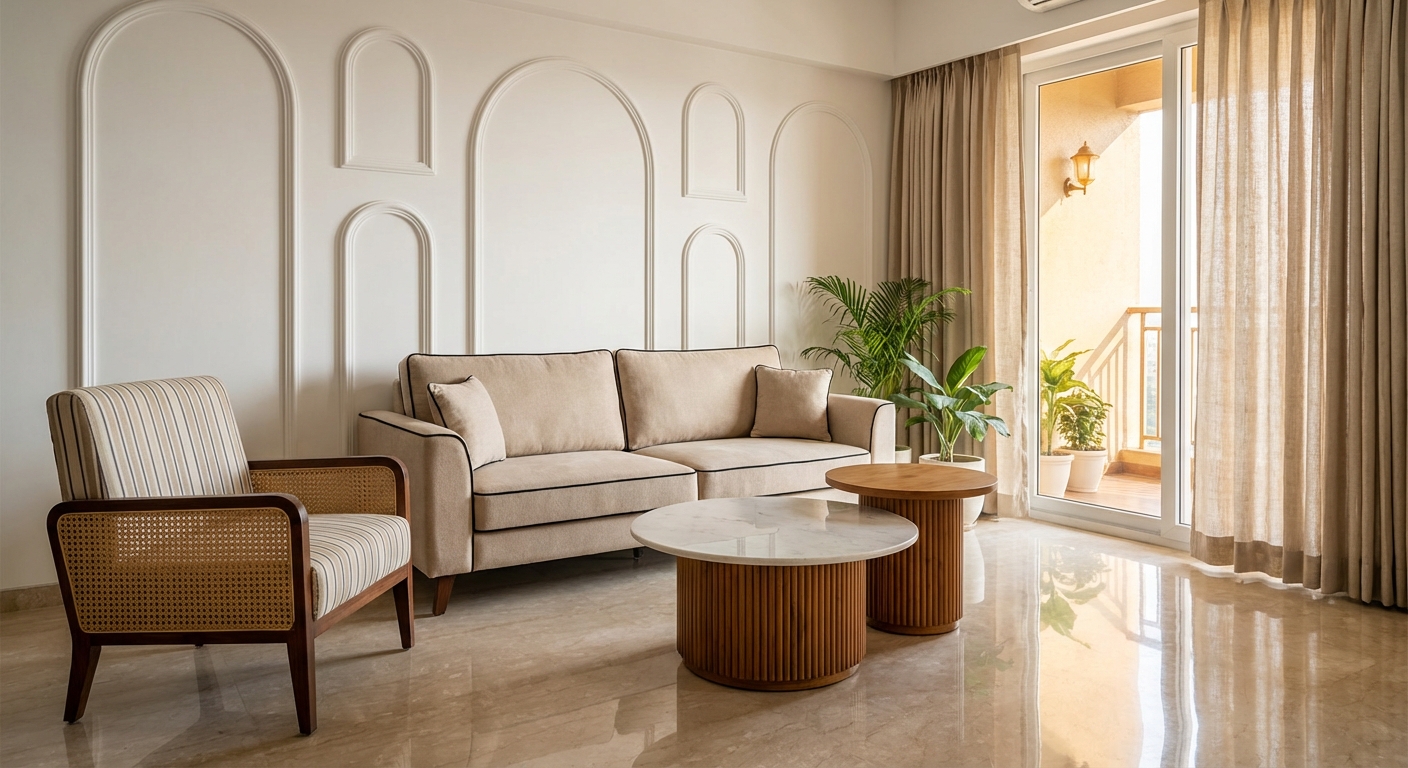 - Architectural Softening: The use of large-scale arches and curved recesses in the living and bedroom areas to break rigid rectilinear lines.