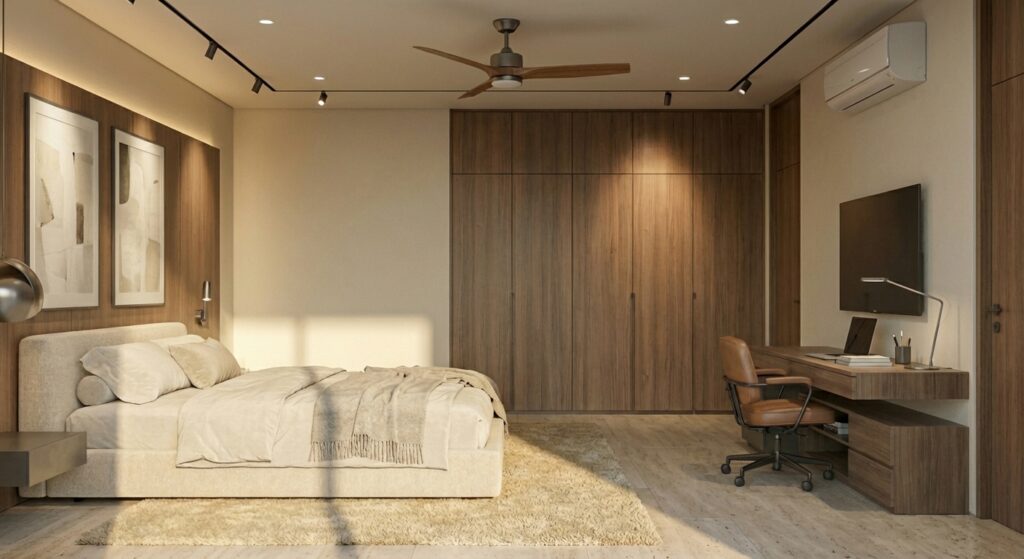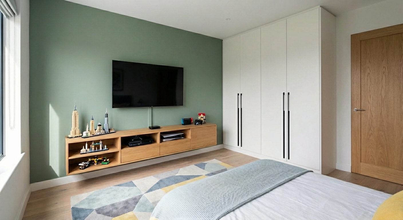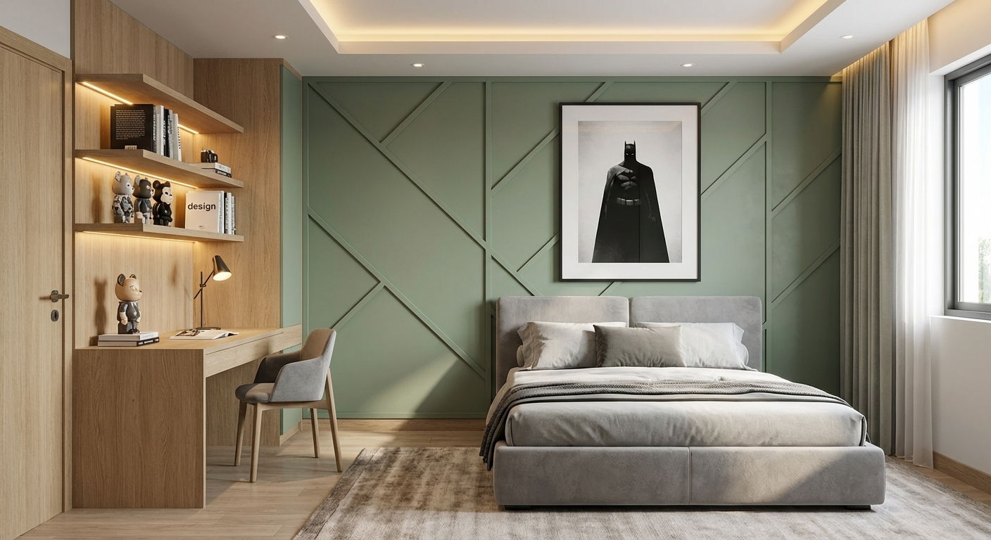 - Bedroom 02 (Kids/Study): Features geometric wall molding and sage green palette.
