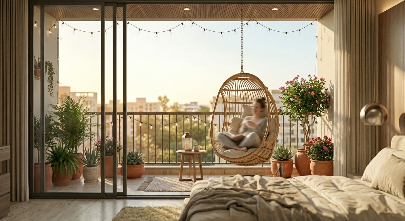 - Balconies: Two distinct outdoor zones (Social deck with high seating; Private bedroom deck with swing).