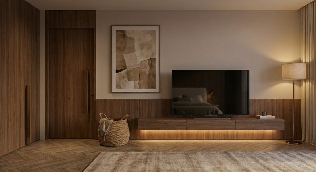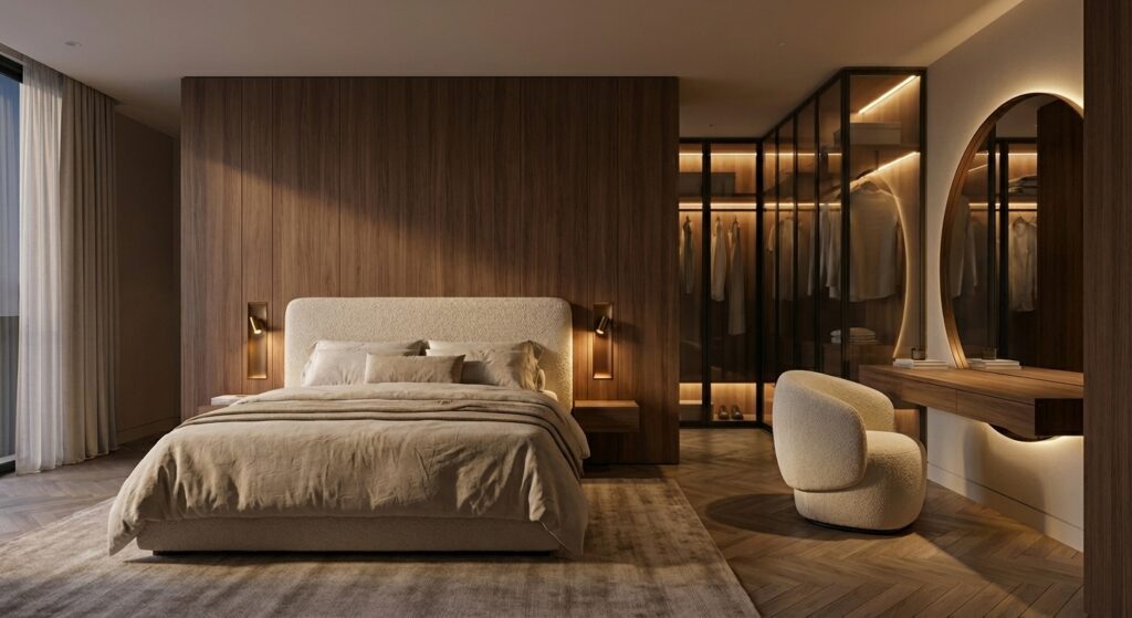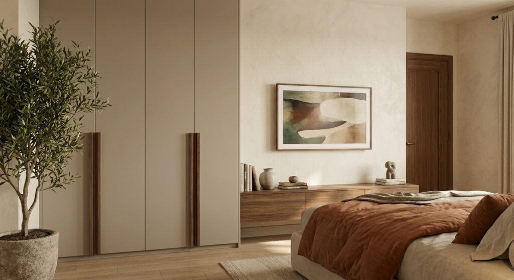 - Joinery Detailing: Extensive use of fluted wardrobe fronts and vanity units in varying hues (terracotta, sage green, and plum) to add rhythm and depth.