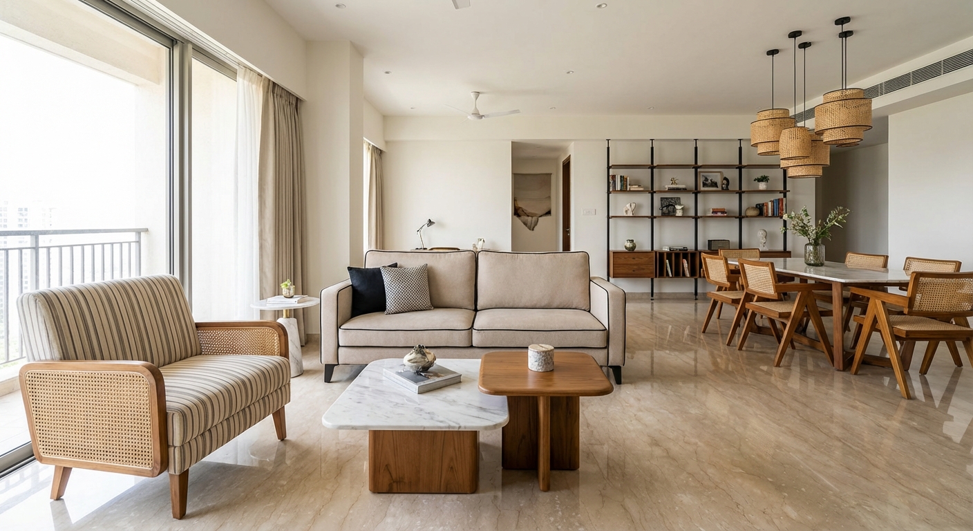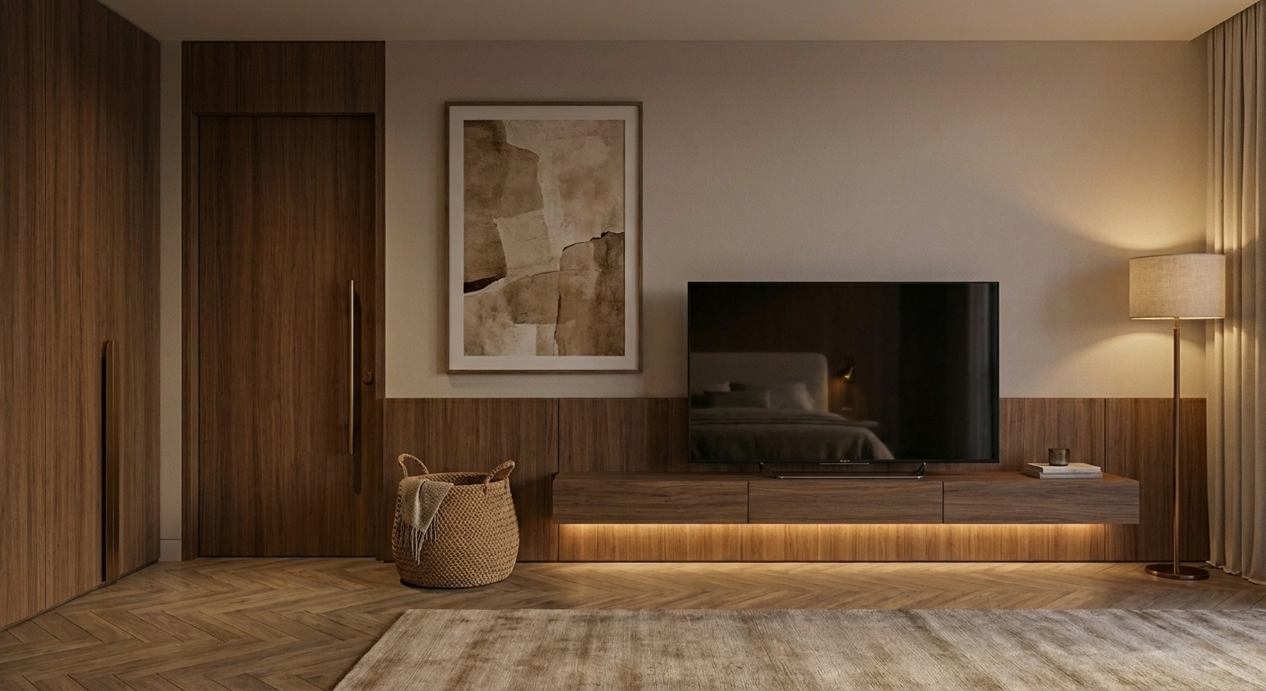 The Tactile Script represents a nuanced dialogue between modern minimalism and classical warmth. This residential interior project transforms a high-rise apartment into a serene sanctuary through a rigorous yet organic material palette. The spatial planning prioritizes fluidity, utilizing open metal-and-wood shelving systems to demarcate the living and dining zones without obstructing light or visual connectivity.