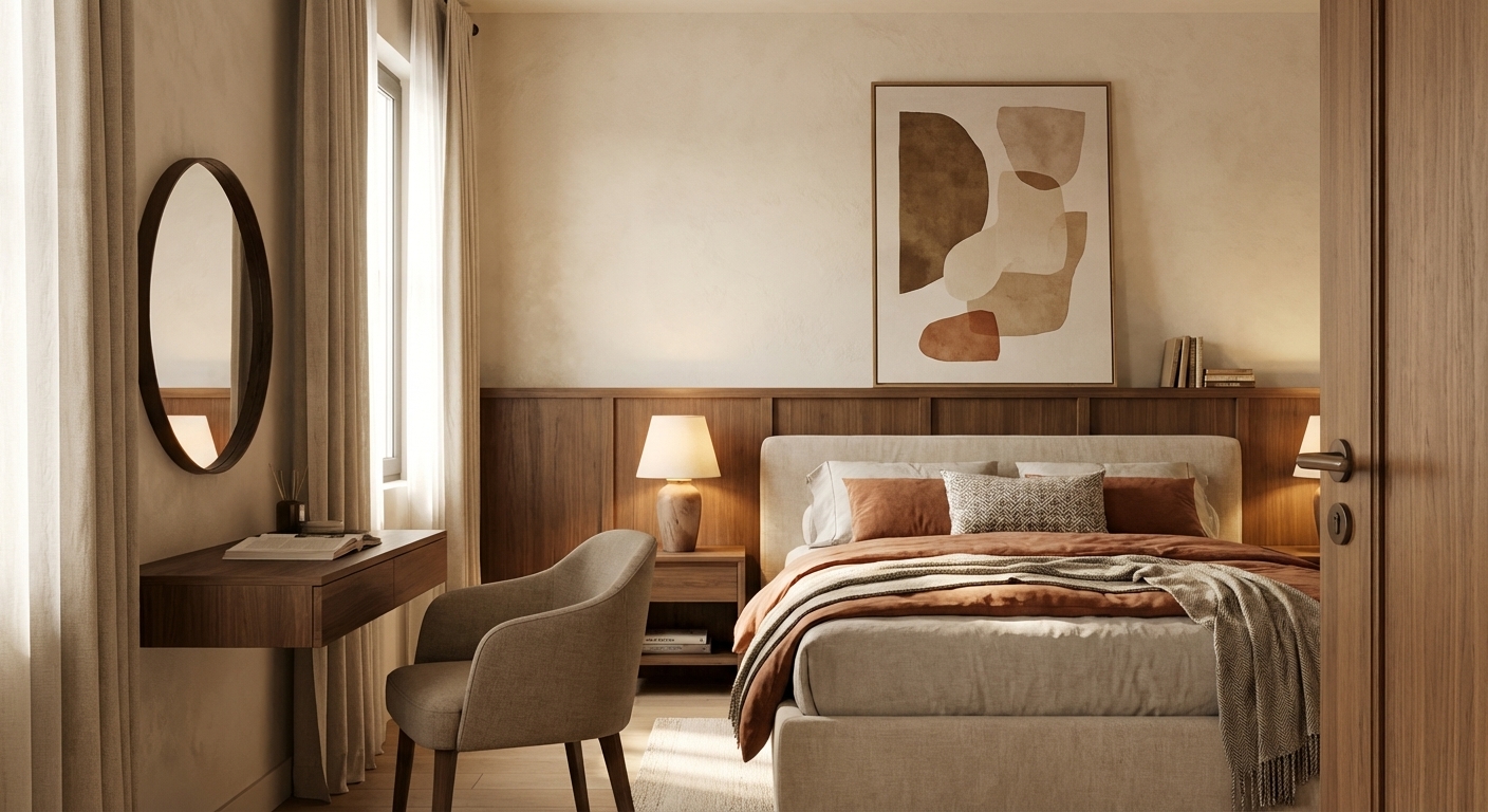 - Bedroom 03 (Guest): Features low wainscoting and warm earth tones.