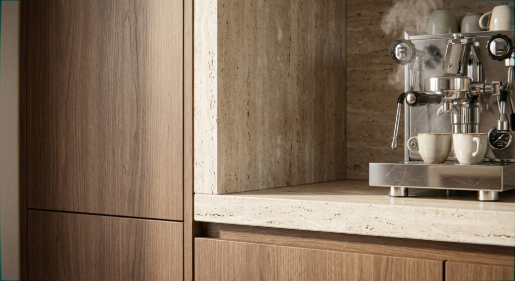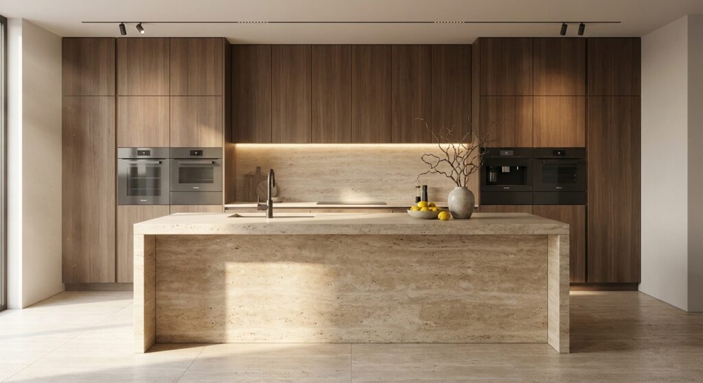 The design language is anchored in the juxtaposition of textures: smooth travertine stone surfaces contrast with the organic warmth of woven rattan joinery and the rhythmic precision of timber grid paneling. A soft, neutral color envelope is punctuated by architectural wall moldings—ranging from classical arches in the living area to sharp geometric lines in the private quarters.