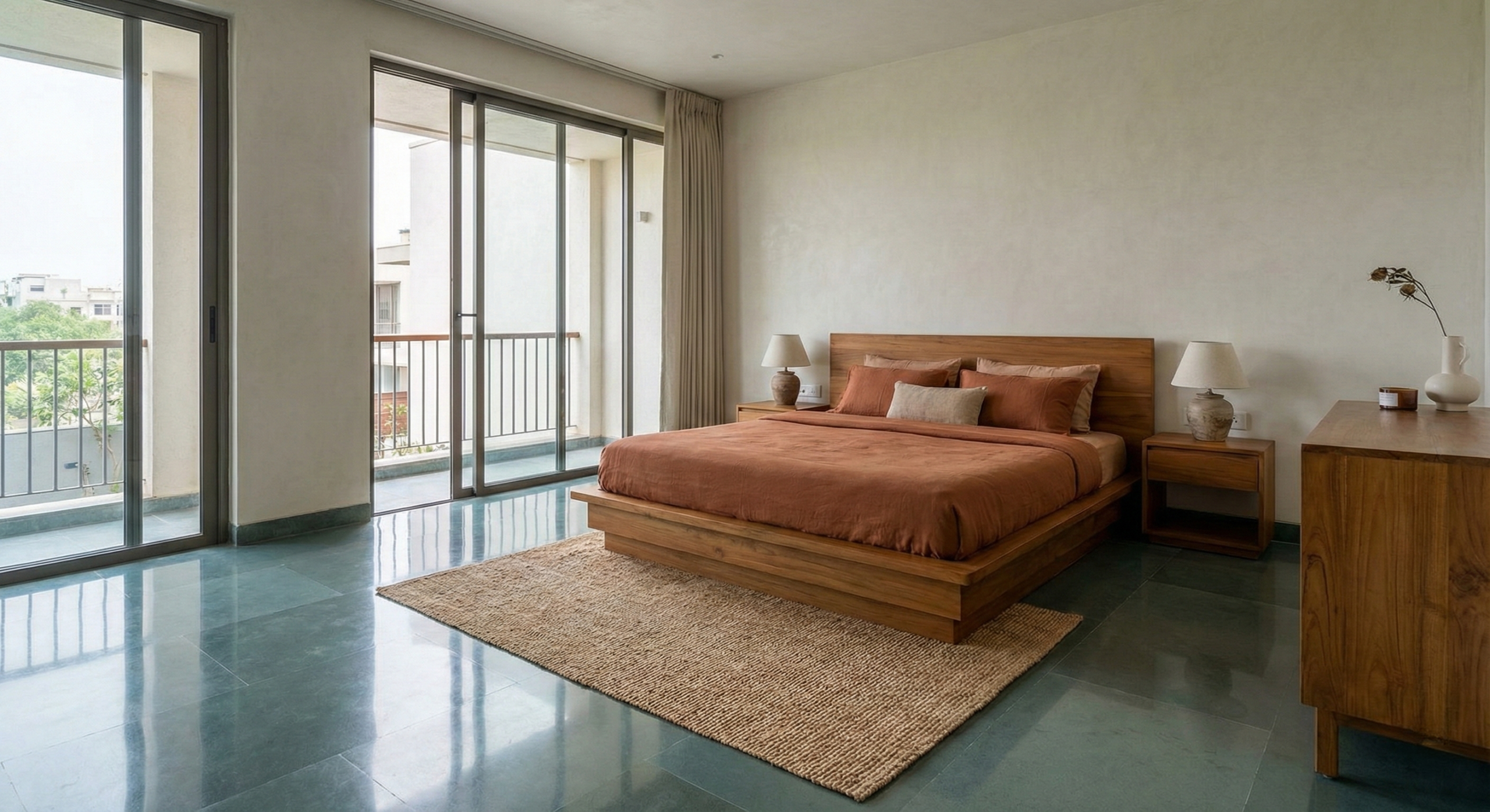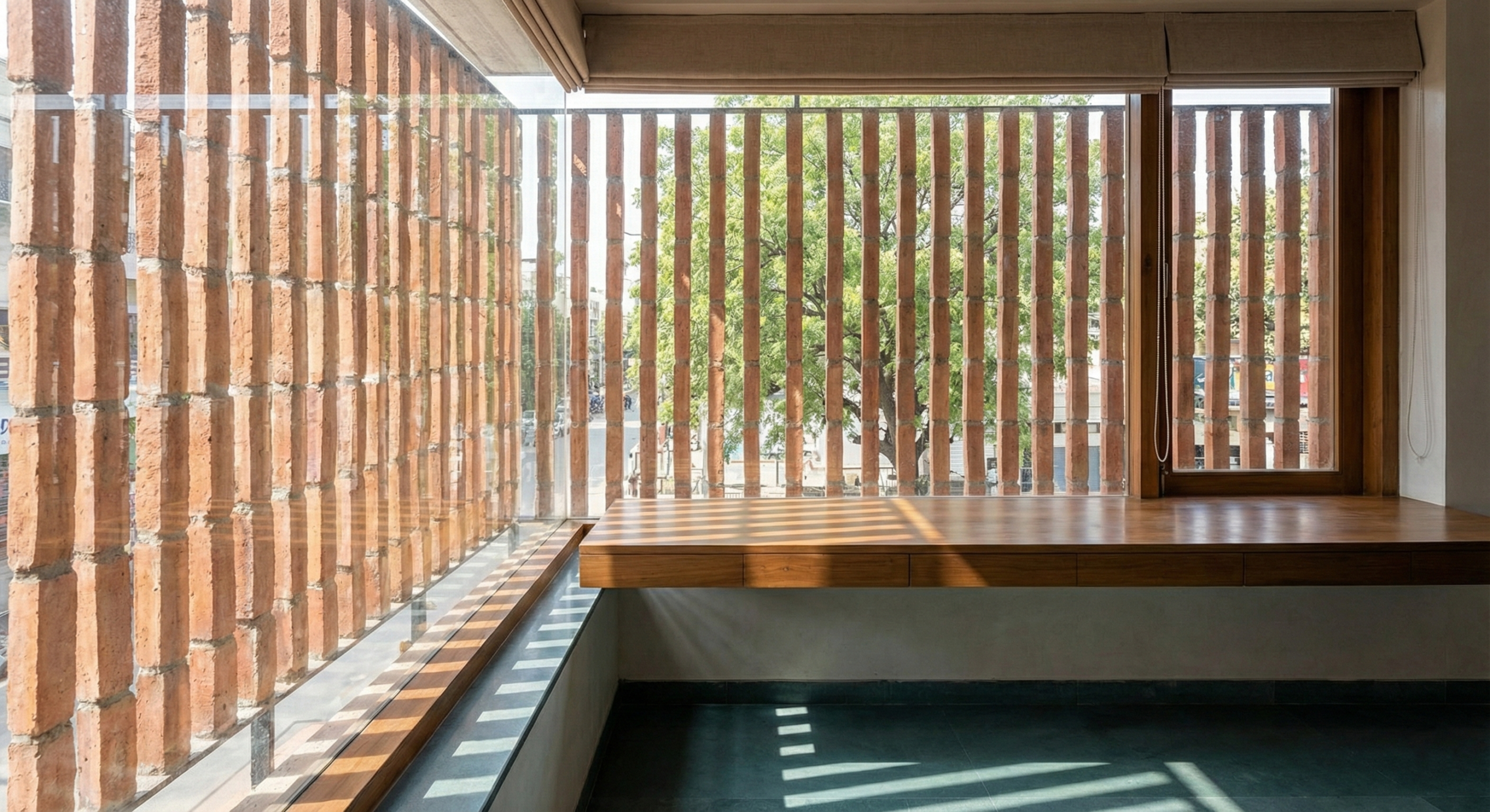 • Facade Strategy: A custom terracotta louver system acts as a thermal buffer and privacy screen, softening the building's brutalist geometry.