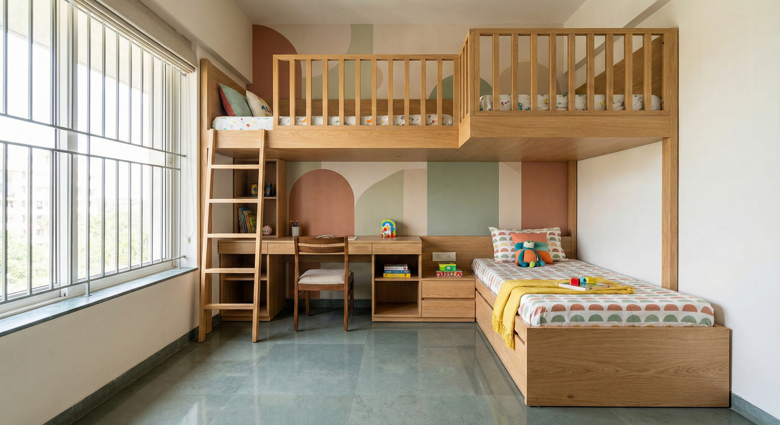 • Bedroom(s): Master suite with balcony access; Kids' room with loft bed.