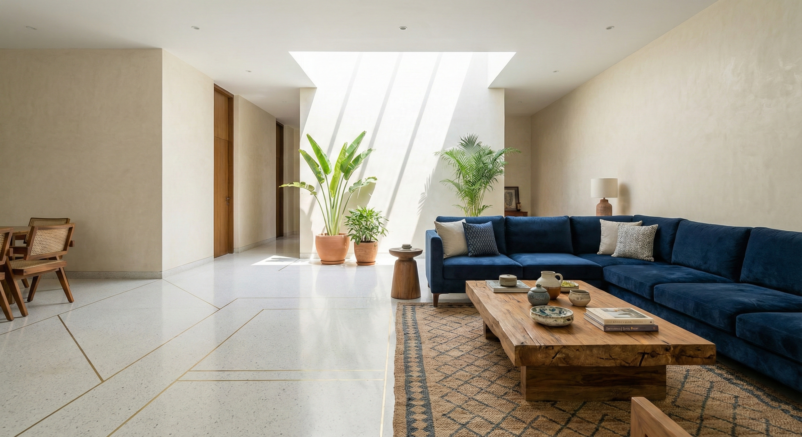 • Living + Dining: Large open-plan layout with double-height volume and skylight.