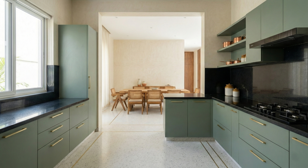 • Kitchen Area: Open plan with breakfast counter, sage green joinery, and black countertops.