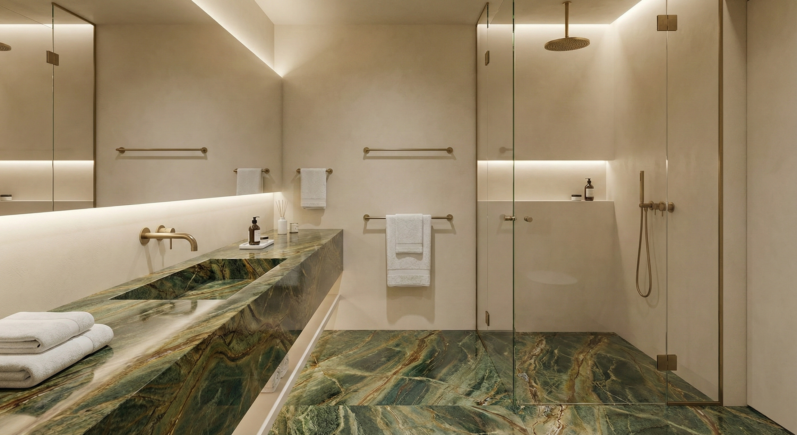 • Bathroom(s): Luxury ensuite featuring green marble cladding and walk-in showers.